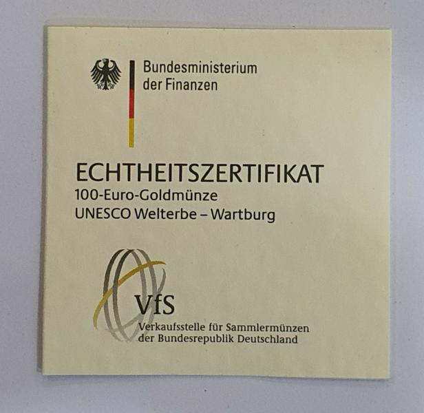 100 Euro Gold 2004 "Wartburg" mit original Münzetui und Beschreibung, 1/2 oz Feingold 999,9