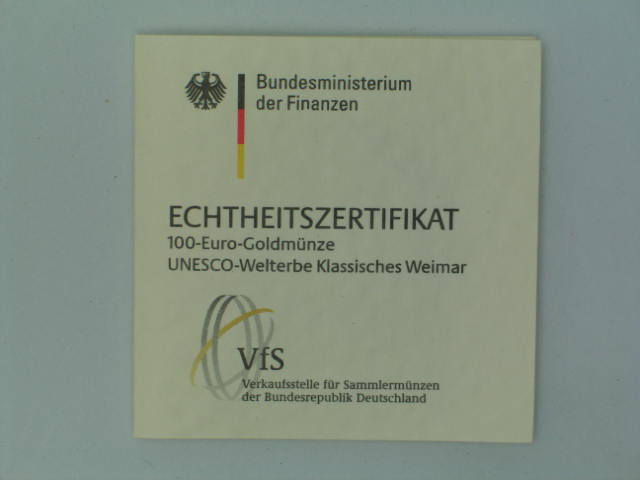100 Euro Gold 2006 "Weimar" mit original Münzetui und Beschreibung, 1/2 oz Feingold 999,9