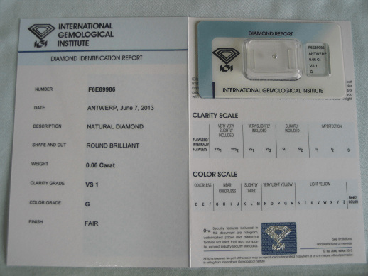 Diamant im Brillantschliff 0.06 ct / VS1 / G / Fair / mit IGI Report