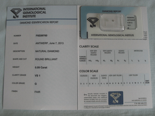 Diamant im Brillantschliff 0.09 ct / VS1 / G / Fair / mit IGI Report