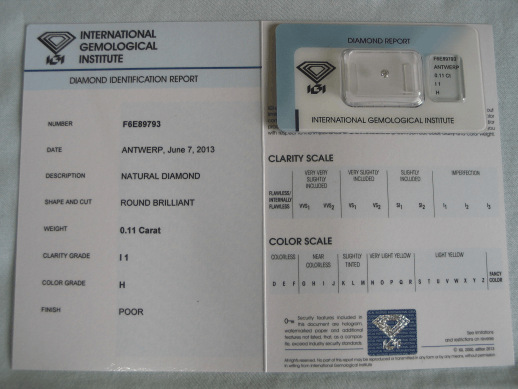 Diamant im Brillantschliff 0.11 ct / I1 / H / Poor / mit IGI Report