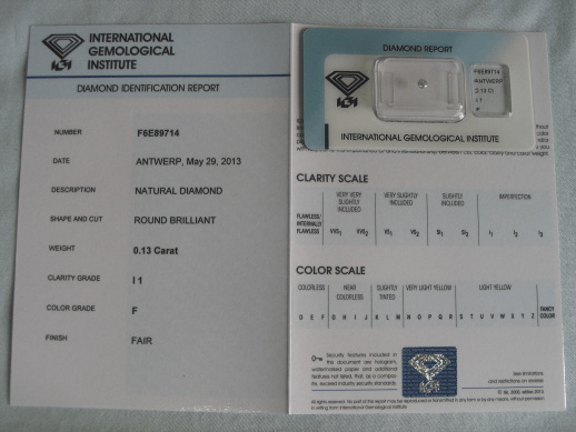 Diamant im Brillantschliff 0.13 ct / I1 / F / Fair / mit IGI Report