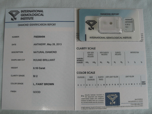 Diamant im Brillantschliff 0.16 ct / SI2 / L, Faint Brown / Good / mit IGI Report