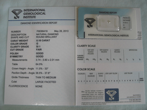 Diamant im Brillantschliff 0.18 ct / SI1 / G / F / G / G / mit IGI Report