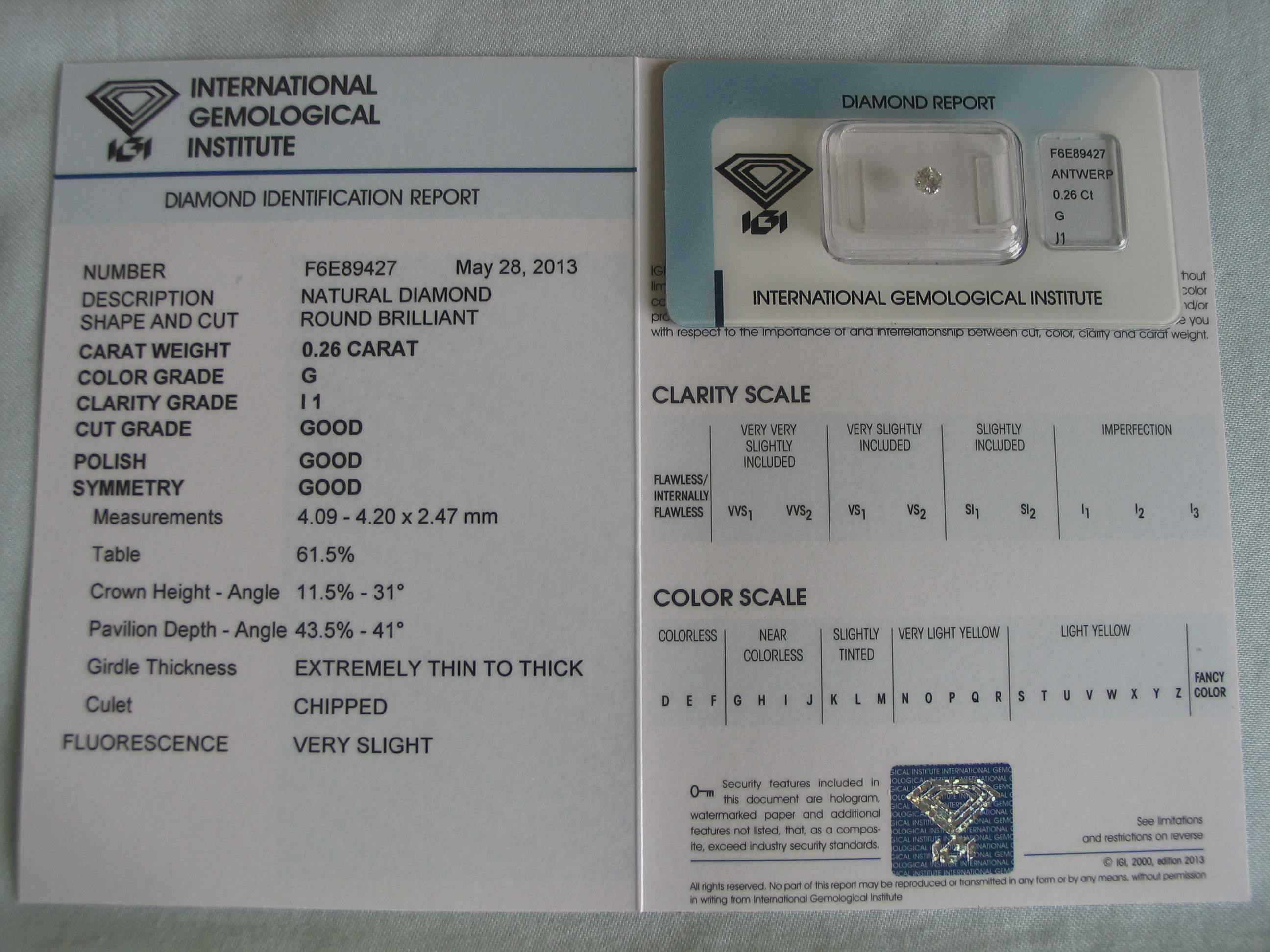 Diamant im Brillantschliff 0.26 ct / I1 / G / G / G / G / mit IGI Report