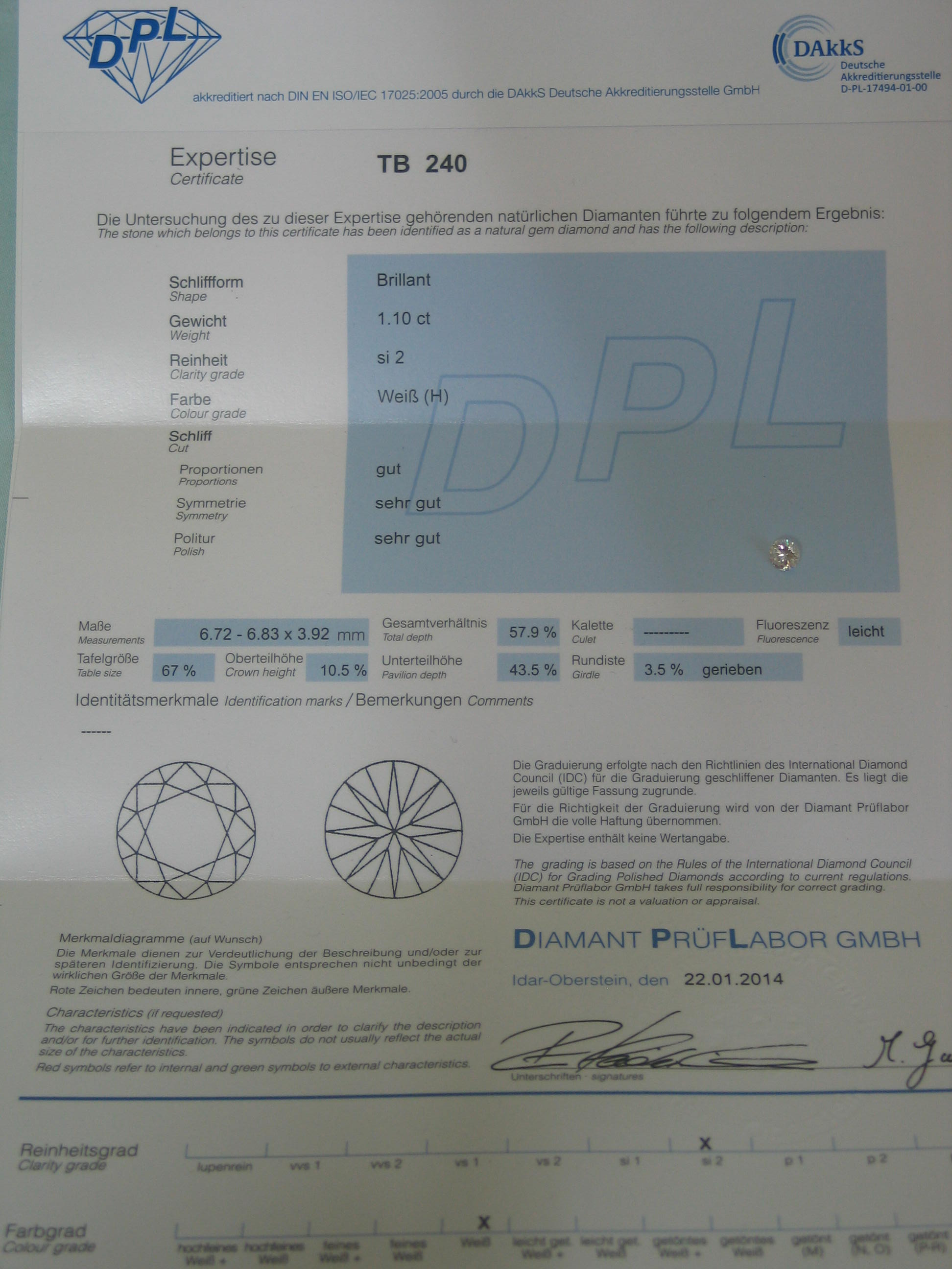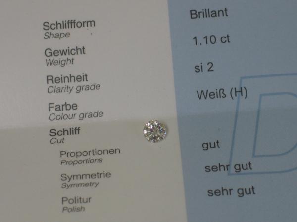 Diamant im Brillantschliff. 1.10 ct / H/ si2/ G/ VG/ VG/ DPL Report