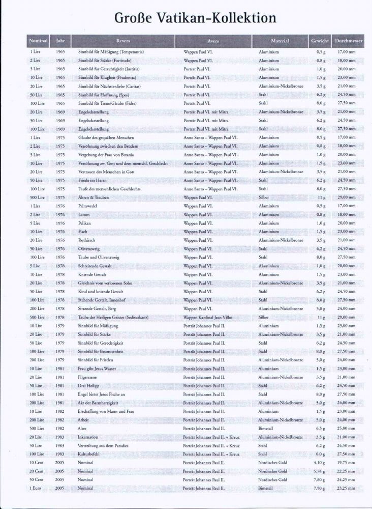 "Große Vatikan Kollektion" Münzbox mit 52 Münzen sowie Auflistung / Informationsblatt