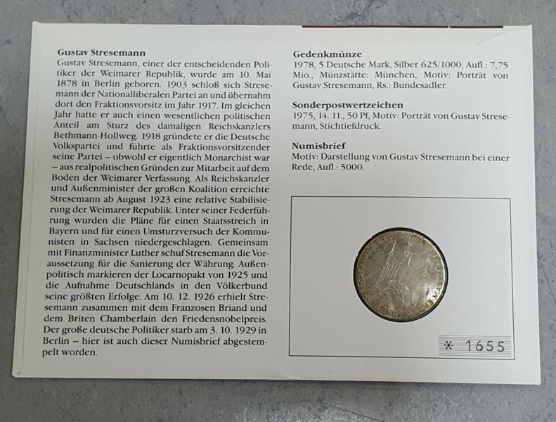Numisbrief mit 5 DM Gedenkmünze "100. Geburtstag von Gustav Stresemann" aus 625er Silber